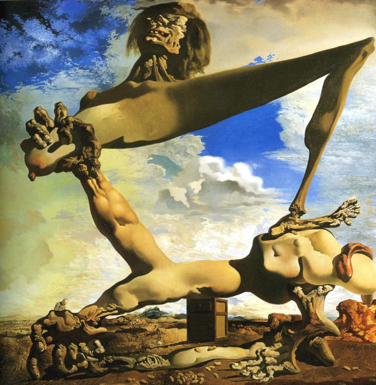 Существа эти изображены на фоне пейзажа, написанного С. Дали в блестящей реалистической манере. Вдоль линии горизонта, на фоне невысокой горной гряды, расположены миниатюрные изображения неких старинных по виду городков. Низкая линия горизонта гиперболизирует действие фантастических существ на первом плане, одновременно она подчеркивает необъятность небосвода, заслоняемого огромными облаками. И сами облака своим тревожным движением еще больше усиливают трагический накал нечеловеческих страстей.
