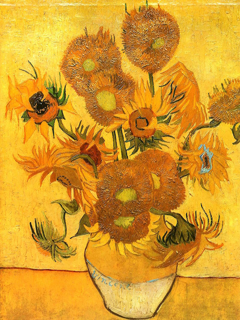 Cолнечные и жизнерадостные подсолнухи Ван Гога, выполнены в пастозной технике. В этой картине стоит обратить на манеру письма художника, точно повторить направления мазков и сохранить многообразие желтых оттенков. Картины считается среднего размера.