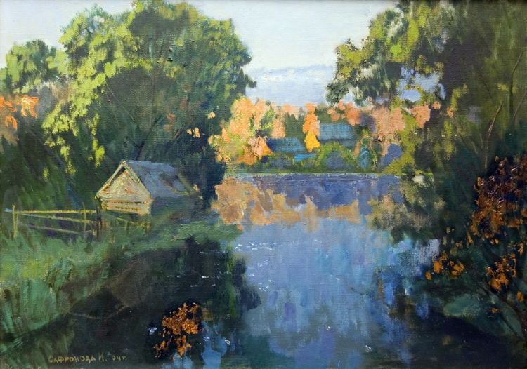 Конечно, большое место в творчестве И. Сафроновой занимают традиционные камерные жанры пейзажа и натюрморта. Для пейзажей характерна спокойная уравновешенность колорита и композиции, виды деревень на берегу рек, зимние заснеженные леса, уголки любимого старого сада ощущаются как передышка между оживленным присутствием действующих лиц.